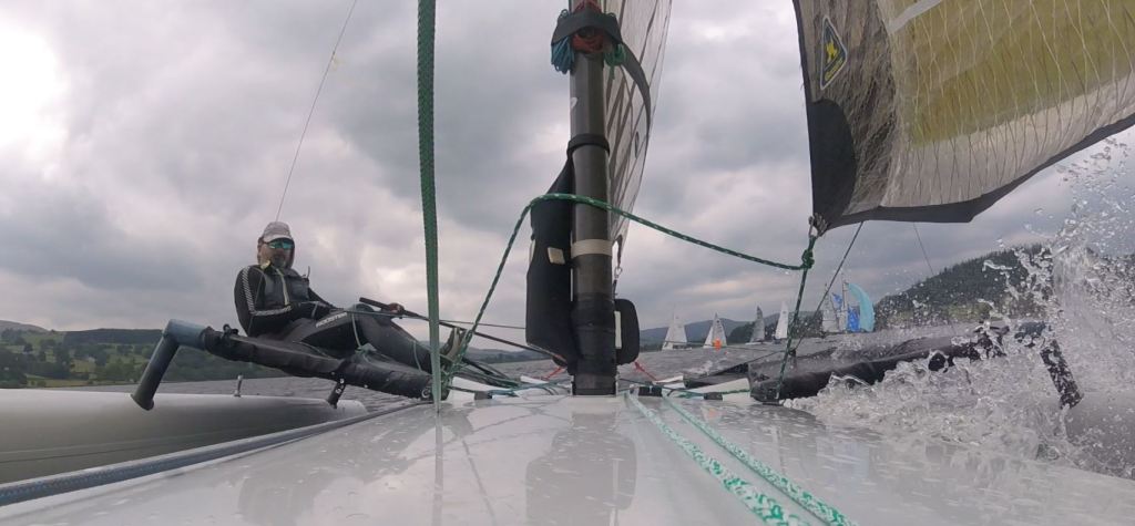 As if by magic, and with only a 15min delay the Sunday race got underway. The top mark had been moved and the course length was about a third as far as the day before. There was breeze but it was shifty and light meaning the beat to the top mark was a test. Once around the mark the screecher was again deployed and the aim was to carry it as far as possible, which was about half way down the course. At this point I discovered the lake was “tidal”! Some might beg to differ but as the wind completely died the now stationary boats spread across the lake certainly appeared to be going backwards. After 5-10 minutes the breeze filled in but had swung 150 degrees and made what was a good blast home into a tight fetch. And that was it – a one lap dash to finish with a toot.